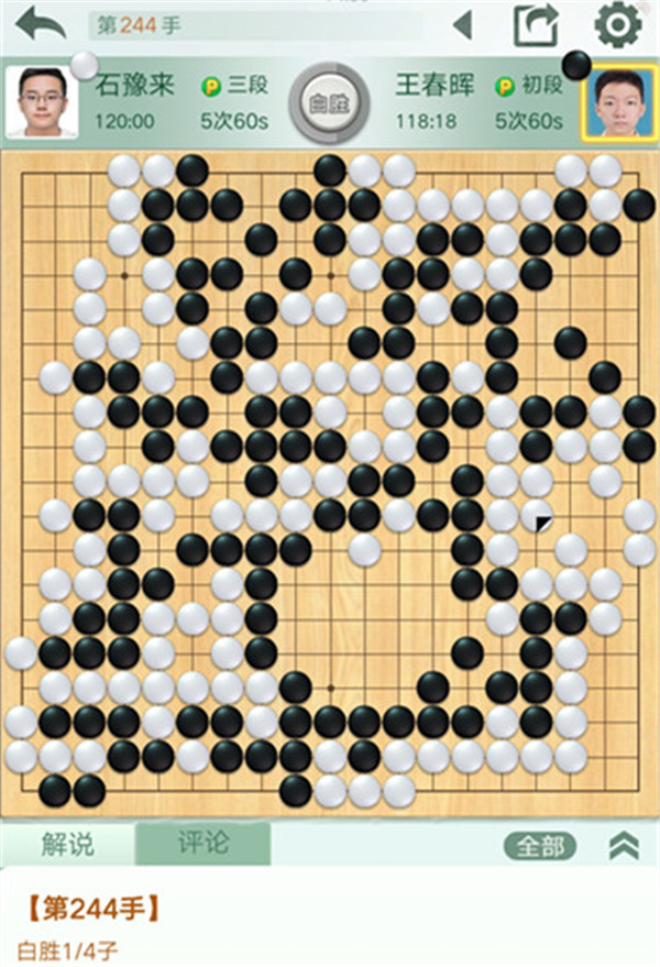 石豫來執(zhí)白對陣小將王春暉。雙方錯進錯出,最終黑棋小官子出現(xiàn)問題,白棋幸運1/4子獲勝。