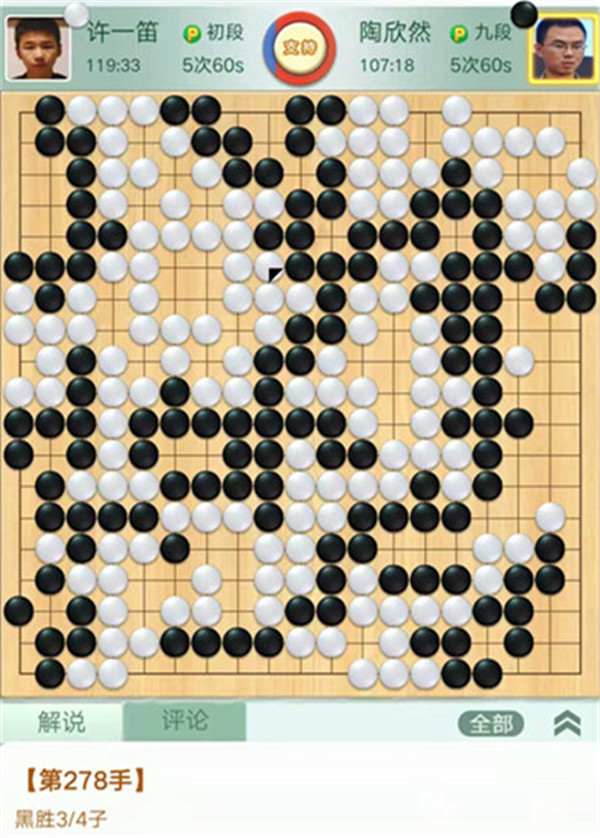 陶欣然執(zhí)黑對陣新初段許一笛。開局下邊黑棋稍虧,之后在左下角獲得便宜黑棋領(lǐng)先。大官子黑棋有所失誤局勢又是白好。之后小官子時候白棋又有失誤,黑棋幸運的3/4子獲勝。
