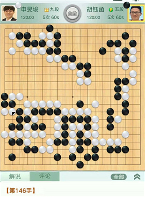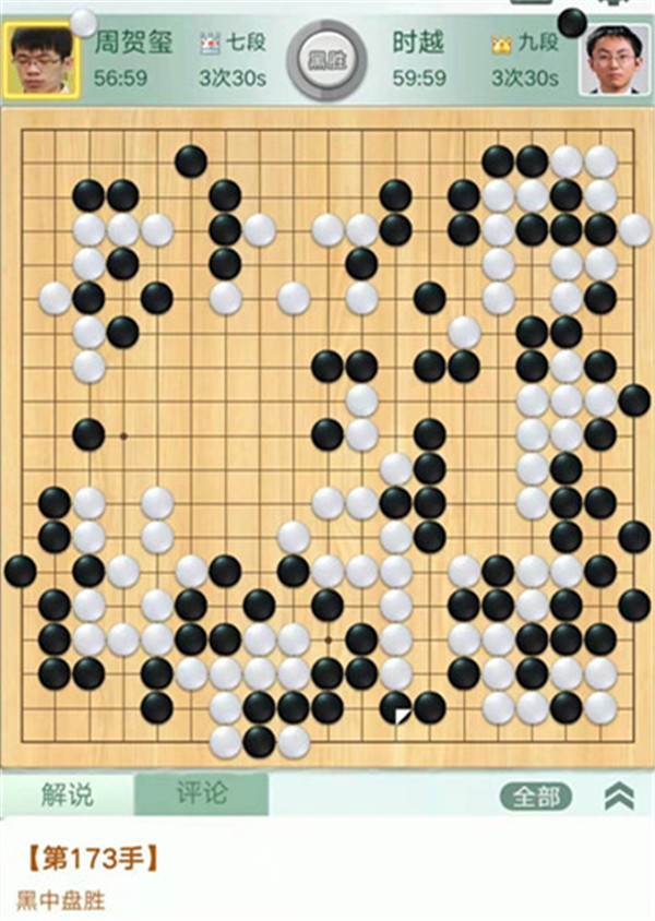 時越快棋執(zhí)黑對陣周賀璽。中盤黑棋在右邊沖擊白棋時候,白棋沒有下出一路立的妙手,而是選擇了做劫,劫爭轉(zhuǎn)換后黑棋全吃右邊大棋,已成勝勢。之后黑棋又在下邊白空出棋再活出一塊,中盤獲勝。