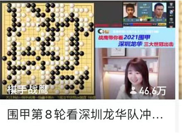 形勢大好,深圳龍華隊網(wǎng)上直播合作人,虎牙直播間圍棋知名主播戰(zhàn)鷹這里自然也是“門庭若市”,人數(shù)沖上46萬大關(guān)。賽后,石豫來到直播間作客,小帥哥自然受到熱捧!深圳龍華隊的后續(xù)戰(zhàn)況仍將在這里直播哦,關(guān)注戰(zhàn)鷹講棋,人美、棋強、口才好,是知名的圍棋主播。