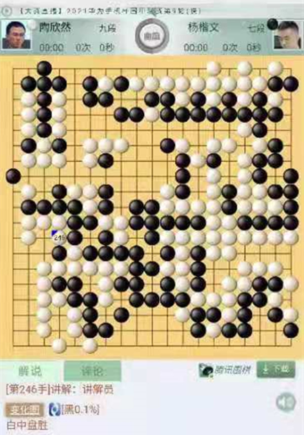 三臺(tái)陶欣然執(zhí)白對(duì)陣等級(jí)分排名29位的楊楷文。開局右邊黑棋沖擊白棋將白分?jǐn)?,但是由于棋形沒有下對(duì),反而用來斷開白棋的棋筋被吃,白棋早早進(jìn)入勝勢(shì)。這一盤是此輪深圳龍華隊(duì)唯一勝局,不易!為陶欣然點(diǎn)贊!