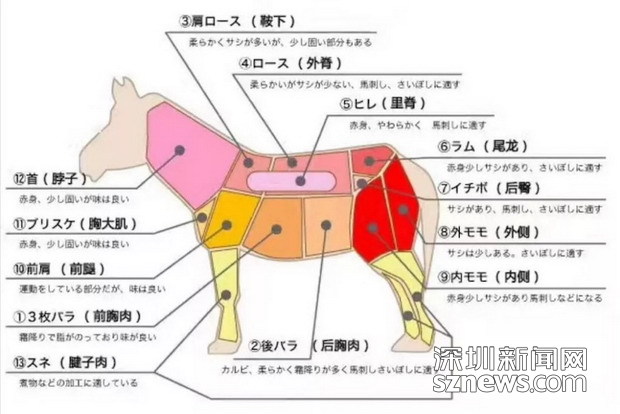 馬能做成刺身的部位相當(dāng)?shù)挠邢?,依照油花分布大致可以分為腹?卜口)、霜降、赤身等不同的等級(jí)。其中最稀有的的“三枚腹”肉,一匹五百公斤的馬只能產(chǎn)出大約5-6公斤,肉質(zhì)口感近似于藍(lán)鰭金槍魚中腹肉。