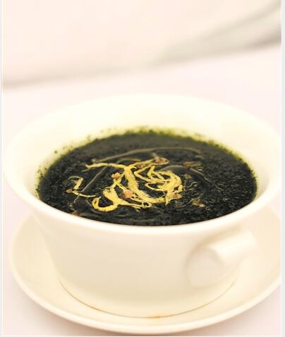 首先將菠菜飛水,再用料理機(jī)打成蓉,可以整棵菠菜放入料理機(jī),不會(huì)浪費(fèi)“紅根”。然后在平底鍋用豬油將菠菜蓉推開,最后放入雞湯煮沸,加入幾片火腿絲就可以上桌。為什么要加入豬油呢?周師傅解釋說(shuō),因?yàn)椴げ巳绻环庞偷脑?會(huì)比較“糠”(粵語(yǔ)),用豬油推開后羹就變得又滑又香。
