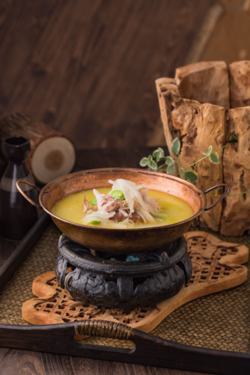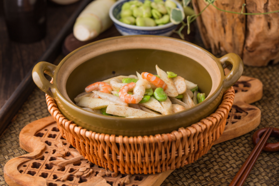 食材多來自水澤,藕帶、菱角、茭白、蠶豆瓣、大蝦仁,自制蝦醬爆炒起香,時蔬的白綠點(diǎn)綴蝦仁的淡粉,如青荷托芙蓉之色,砂鍋盛上,滋滋作響,讓人眼前浮現(xiàn)出“蛙聲喧夏夜,魚影動荷塘”的畫面。