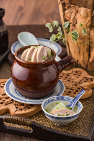 鴨是暑天的清補(bǔ)佳品,健脾化濕,冬瓜性寒味甘,清熱生津。板鴨與冬瓜加入小香蔥煨湯,慢火細(xì)燉出,冬瓜軟爛,板鴨酥香,湯味清鮮,是一道僻暑除煩的夏日美味。
