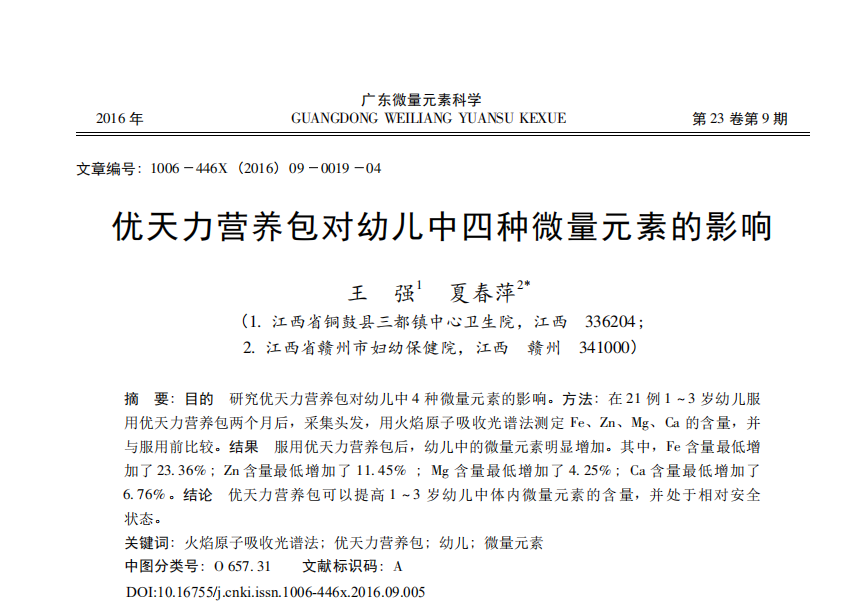 王強,夏春萍.優(yōu)天力營養(yǎng)包對幼兒中四種微量元素的影響[J].廣東微量元素科學,2016