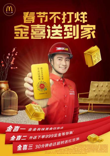麥當(dāng)勞外送服務(wù)麥樂(lè)送在春節(jié)期間也加入“金金”有味的體驗(yàn),為餐廳以外的顧客送出三重“金”喜:全系列新品登陸麥樂(lè)送平臺(tái),通過(guò)麥當(dāng)勞官方渠道和第三方訂餐平臺(tái)都可以下單;麥樂(lè)送下單也可以參與抽獎(jiǎng),贏取周大福足金;春節(jié)期間美食30分鐘必達(dá),超時(shí)將贈(zèng)送紅豆派。