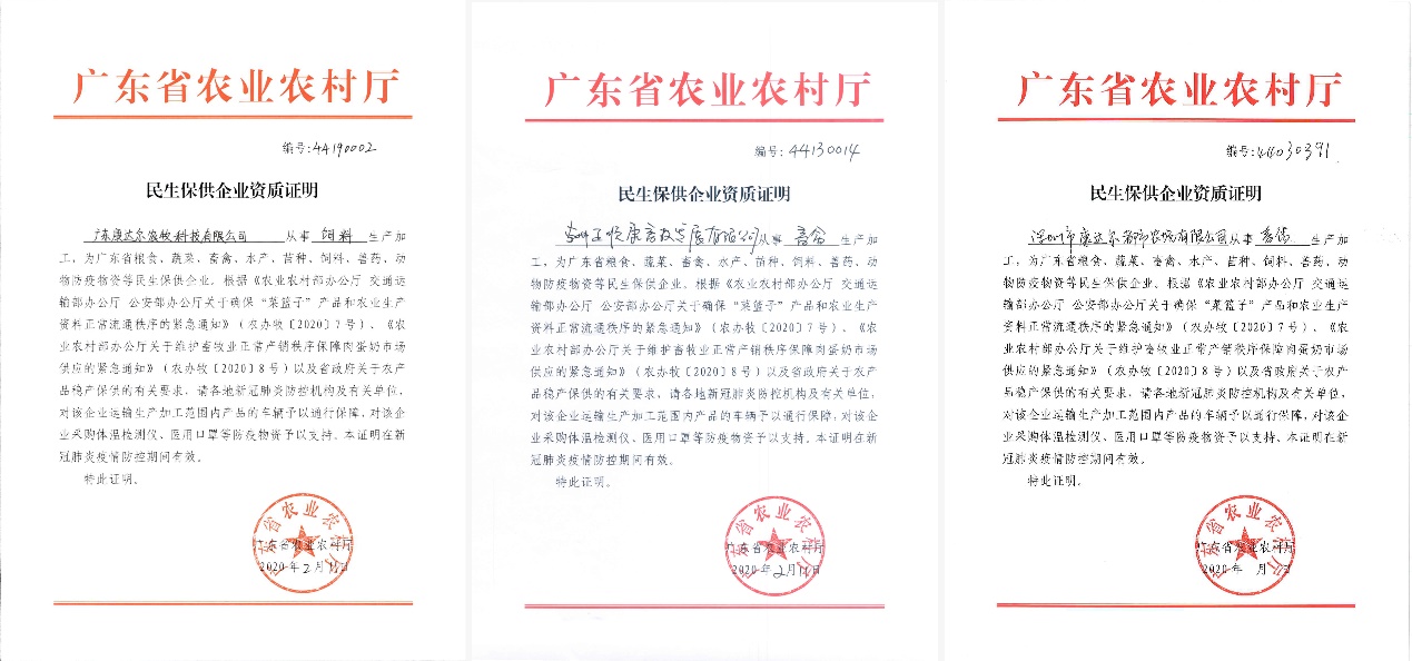 見(jiàn)圳客戶端·深圳新聞網(wǎng)2020年2月13日訊 農(nóng)產(chǎn)品是群眾生活必需品,農(nóng)業(yè)生產(chǎn)資料是農(nóng)業(yè)生產(chǎn)的必需物資。2020年2月11日-12日,康達(dá)爾集團(tuán)農(nóng)業(yè)板塊三大公司廣東康達(dá)爾農(nóng)牧科技有限公司、惠州正順康畜牧發(fā)展有限公司、深圳市康達(dá)爾都市農(nóng)場(chǎng)有限公司先后獲批“民生保供企業(yè)”資質(zhì)證明,這將非常有利于各企業(yè)開(kāi)展農(nóng)產(chǎn)品和農(nóng)業(yè)生產(chǎn)資料的保供工作,也意味著康達(dá)爾集團(tuán)在這場(chǎng)防疫保供攻堅(jiān)戰(zhàn)中所發(fā)揮的作用獲得了高度的肯定。