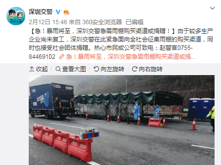 見(jiàn)圳客戶(hù)端·深圳新聞網(wǎng)2020年2月14日訊 2月12日下午約4時(shí),深圳交警官方微博的一條消息牽動(dòng)了深圳紅牛負(fù)責(zé)人張健明的心。該微博寫(xiě)道:“急!暴雨將至,由于較多生產(chǎn)企業(yè)尚未復(fù)工,深圳交警在此緊急面向全社會(huì)征集雨棚的購(gòu)買(mǎi)渠道,同時(shí)也接受社會(huì)團(tuán)體捐贈(zèng)?!?/span>