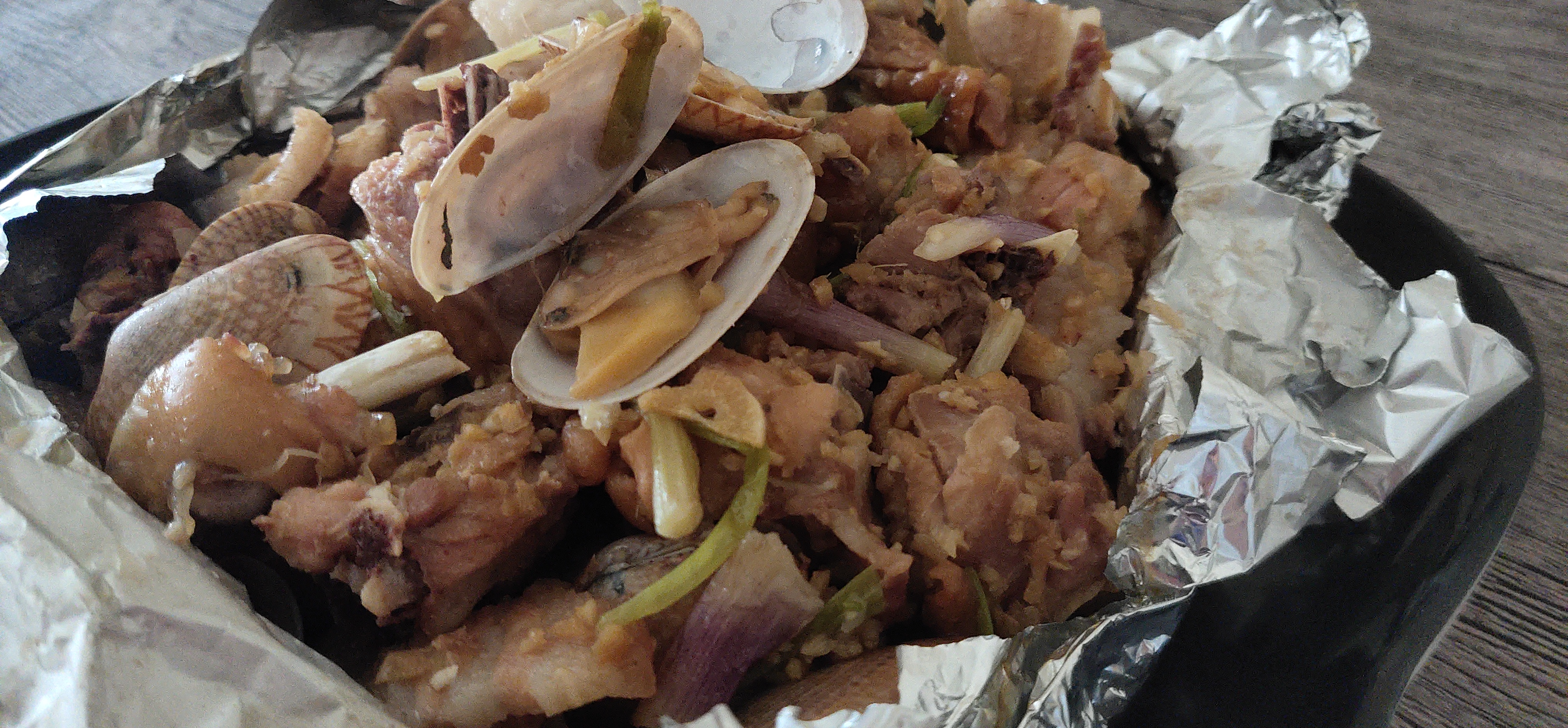 3、二錫紙放在一起后鋪平,先將花甲放在中間,然后再將腌入味的雞肉和五花肉鋪放在花甲上面,再將汁也一起倒入去。