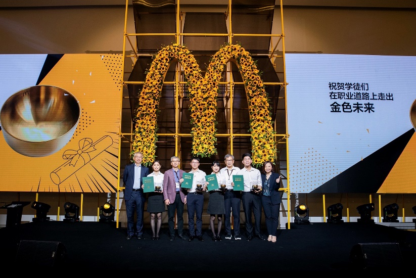 麥當(dāng)勞領(lǐng)導(dǎo)們、陳李翔和陳宇向四位首批畢業(yè)生代表贈送“出師證”和金碗,并向未來學(xué)徒發(fā)出邀請