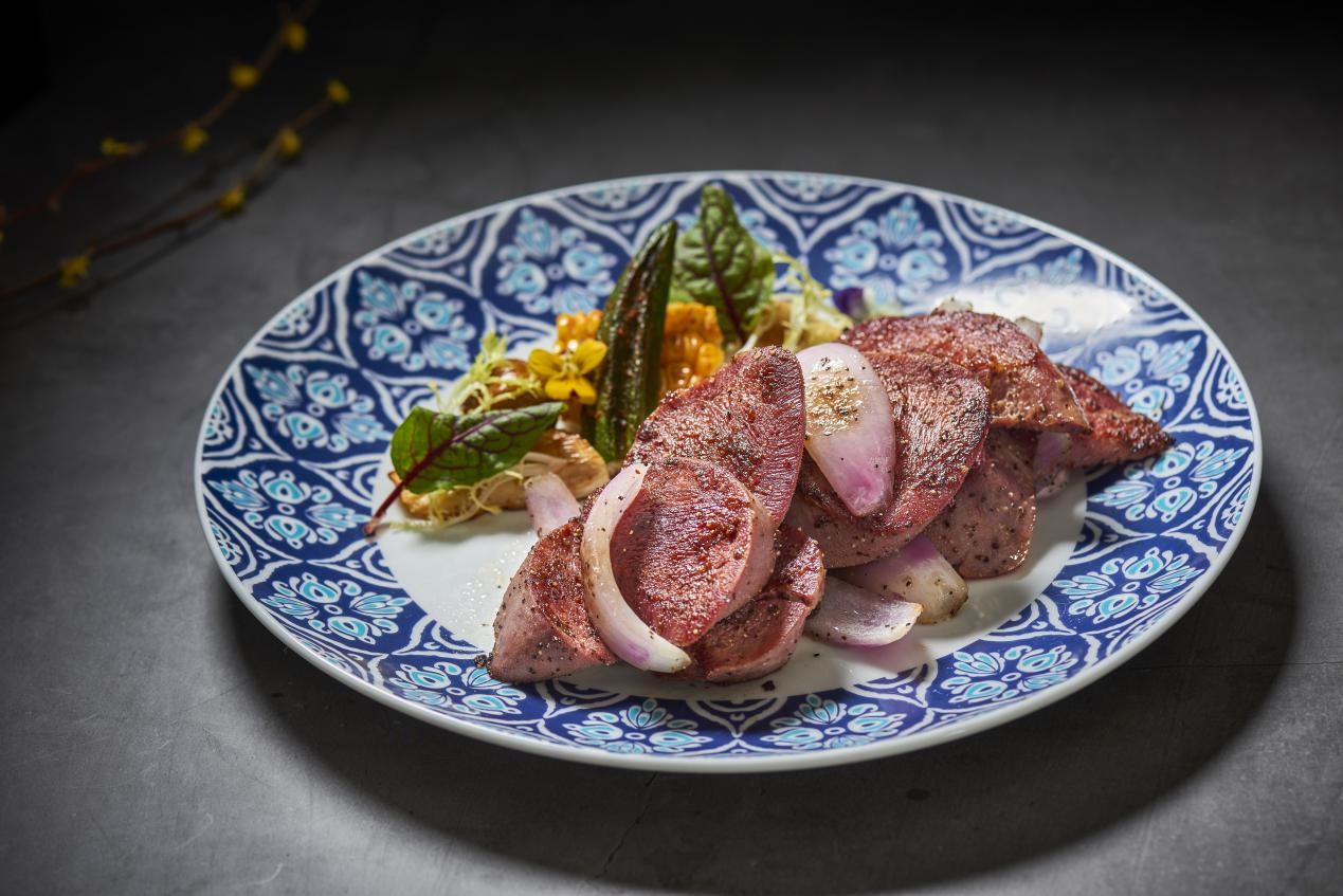 高溫巖燒過的牛舌,撒以黑椒調(diào)味,口感細(xì)嫩,厚切帶來的幸福感,激活疲乏味蕾,純粹原始的咸香即瞬蘊繞口腔。