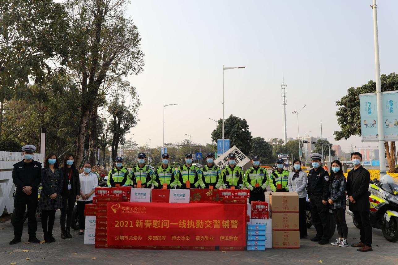 當(dāng)天,市關(guān)愛辦與伊澤熟食、恒大礦泉水集團(tuán)、晨光乳業(yè)、愛康集團(tuán)以及麥克維爾公司五家愛心企業(yè)前往光明區(qū)交警大隊,慰問一線交警,并為交警輔警們送上愛心物資。