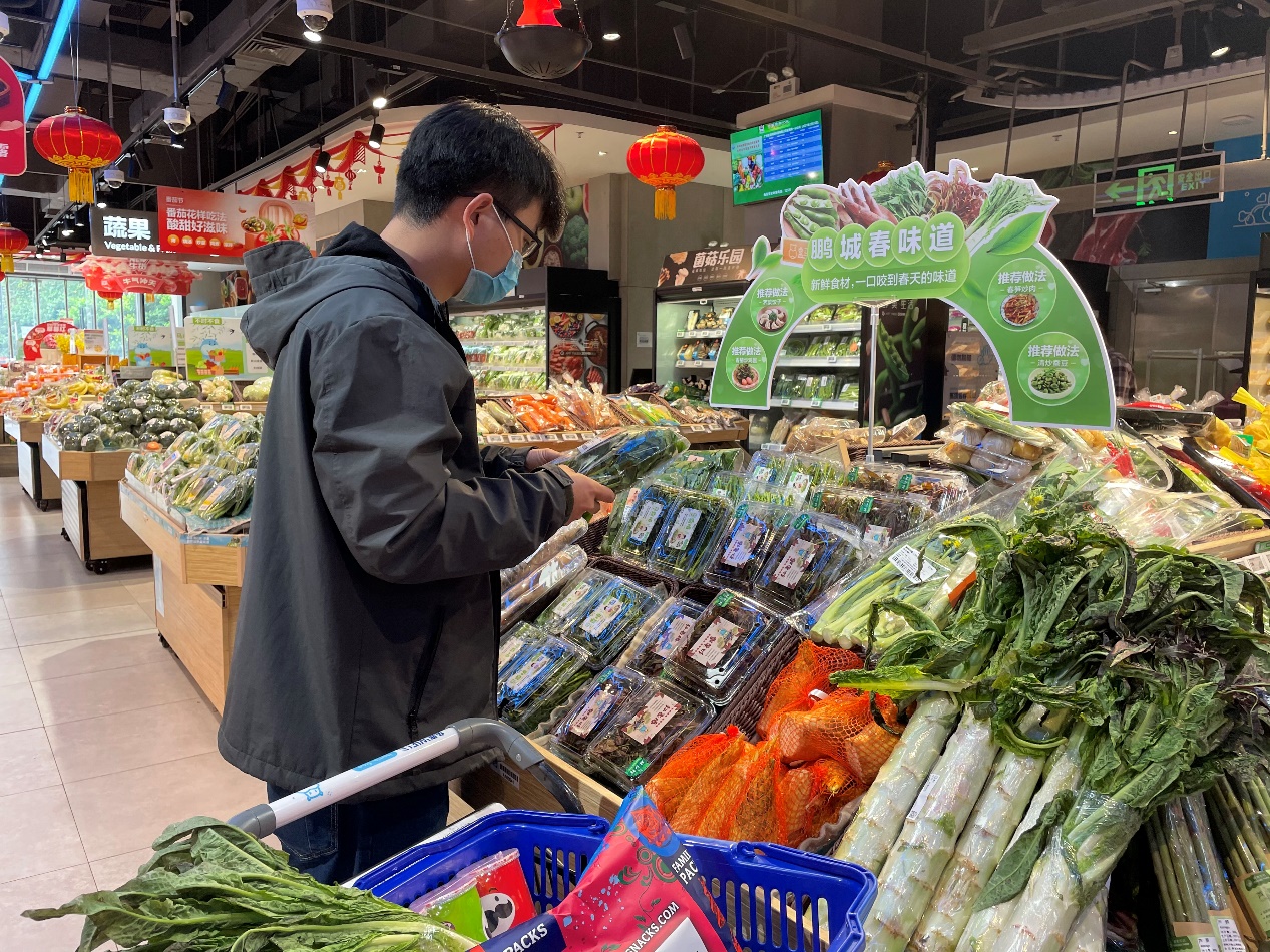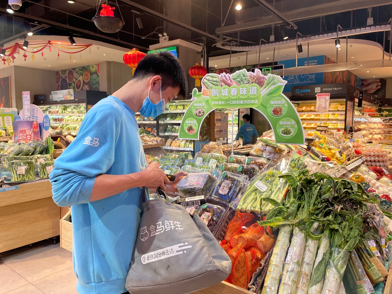 消費(fèi)者通過(guò)手機(jī)下單購(gòu)買春菜,盒馬小二正在揀貨