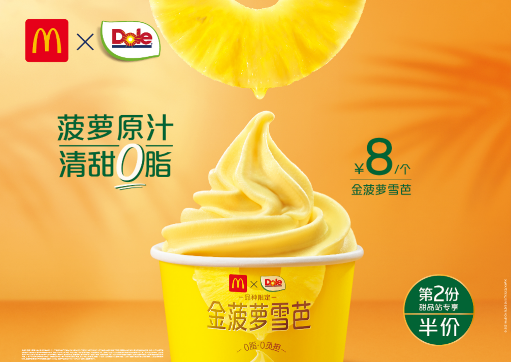 金菠蘿雪芭是麥當勞中國的首個雪芭類產(chǎn)品,使用都樂原榨金菠蘿汁,清甜爽口,濃濃果香無負擔。選用的都樂金菠蘿產(chǎn)自菲律賓棉蘭老島,口感細膩甘甜,果肉金黃多汁。金菠蘿雪芭不含牛奶或奶油成分,脂肪含量為零。該產(chǎn)品已2021年4月21日在麥當勞中國28個城市的2000多個甜品站售賣,限時售價8元,享受第二個半價優(yōu)惠。