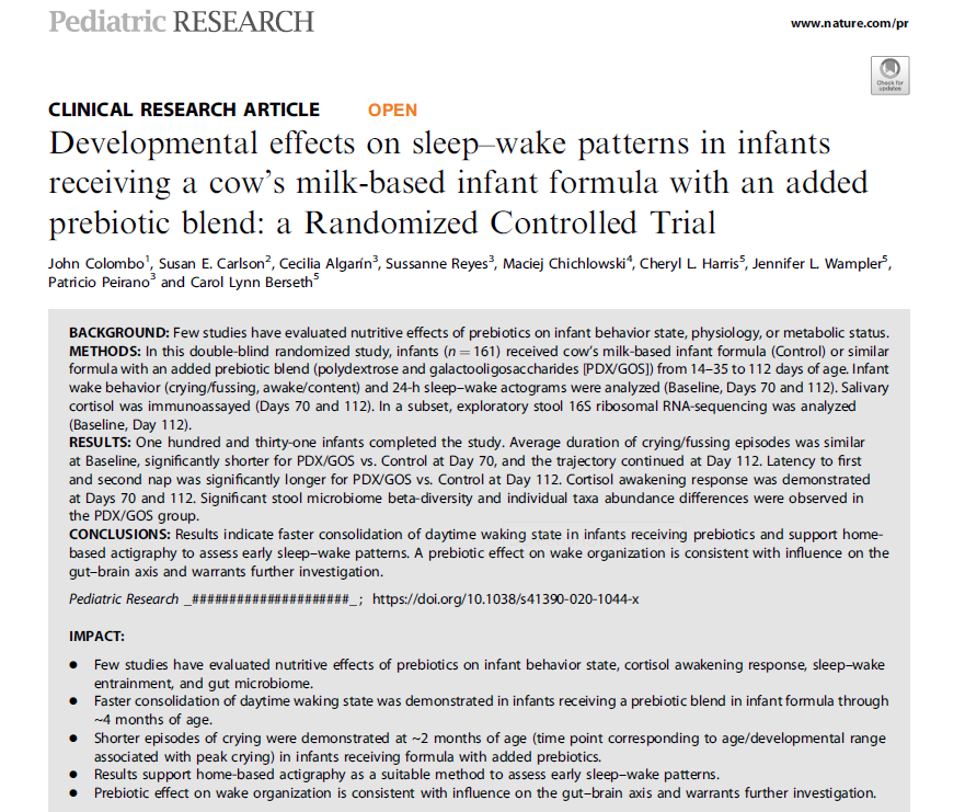 近日,全球知名科學(xué)期刊出版集團自然旗下的 《兒科研究》刊發(fā)最新研究成果顯示,添加PDX+GOS長短鏈益生元組合的配方奶粉能夠加快嬰兒睡眠模式成熟,增加清晨清醒時間,減少寶寶哭鬧,尤其是夜間哭鬧。這一研究采用了雙盲隨機對照的臨床研究方式,率先揭示了寶寶睡眠與腸道營養(yǎng)之間的奧秘,因而引起行業(yè)高度關(guān)注。