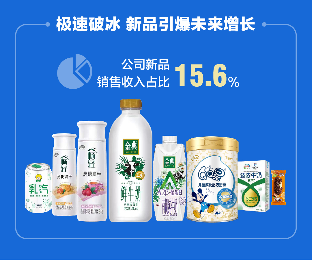 另外,伊利還推出了優(yōu)酸乳“乳汽”氣泡乳、TOORAN來襲黑奶粉、“QQ星”兒童成長配方羊奶粉等健康營養(yǎng)新品,這些能夠滿足消費(fèi)者健康和品質(zhì)生活所需的產(chǎn)品,是伊利對消費(fèi)者信賴的真誠回饋。伊利中報顯示,公司新品銷售收入占比15.6 %,已經(jīng)成為公司業(yè)績增長的新生力量。