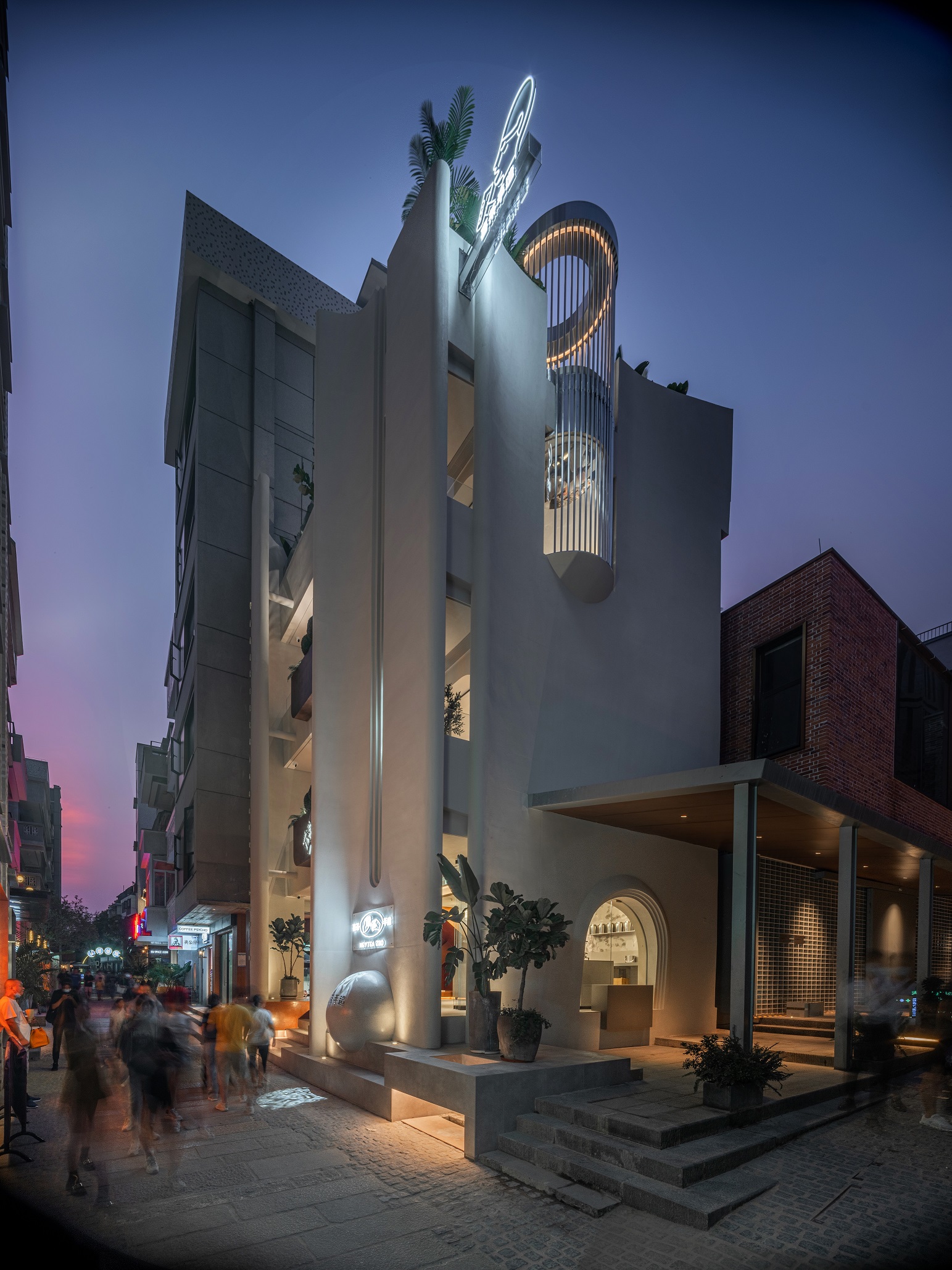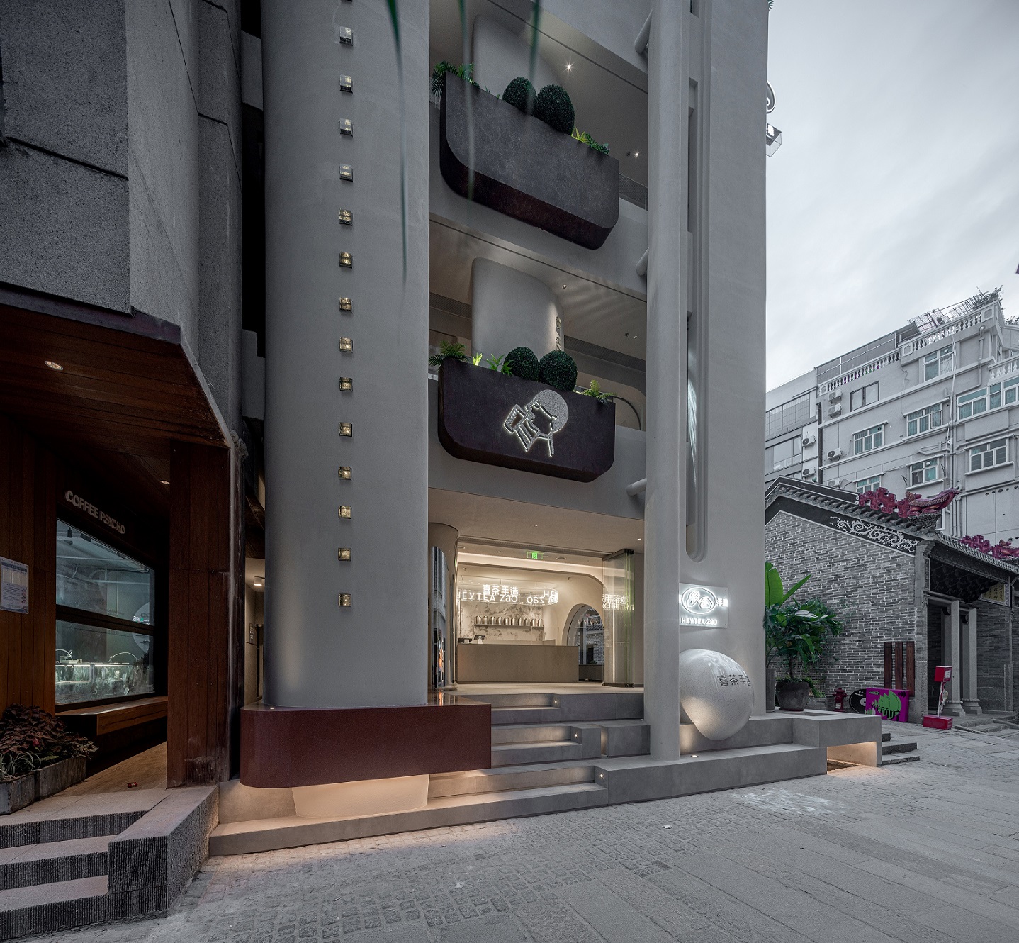 門店整體建筑設計是從幾何圖形中抽象出簡潔線條,改變原先外立面單一的線性結構,突破對于建筑形態(tài)的固有思維。外立面則選用水紋氣泡玻璃磚、做舊的復古外墻肌理漆,二、三樓陽臺花槽由銹鐵材質制成,強調歷史感。同時,整體建筑中有一道空凹槽,自上而下營造水流不息的視覺感、靈動感,形成動靜結合的整體樓面。