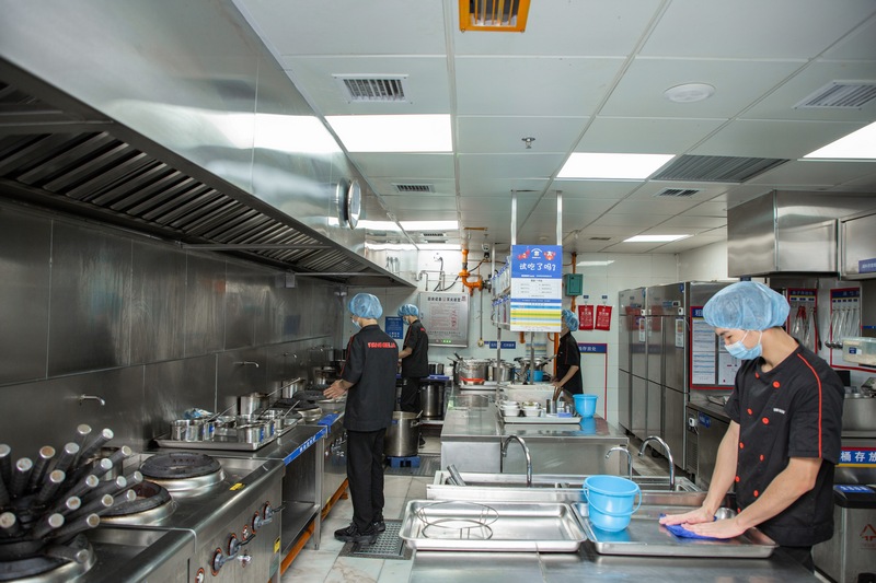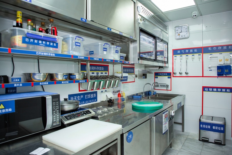 “右手邊是冷菜間,因為食安要求更高,我們都有專門的‘二次更衣室’,在這里更換衣服后,再進入對涼菜進行處理。”負責人表示,在專門的涼菜區(qū)里,則可以看到櫥窗中整齊地貼上了諸如“A1圣女果”“B04魚豆腐”之類的標簽,同時備注“當天生產打烊廢棄”和“加工日期與廢棄日期”等具體操作指示?!懊客泶蜢群?,我們也會用紫外線燈對冷菜間進行半個小時的消毒?!必撠熑搜a充。