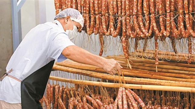 公明祖?zhèn)鲝V式臘腸制作工藝和麥?zhǔn)瞎欧ㄖ谱鞴に囅嘟Y(jié)合的臘腸,風(fēng)味獨(dú)特,色澤飽滿,是餐桌和飯館一道佳品。