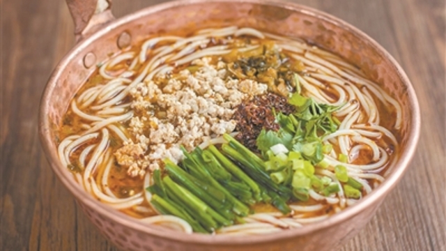 酥肉小鍋米線用小銅鍋來煮,瘦肉末是標(biāo)配,還要加上云南人自家腌制的酸菜才夠勁兒。