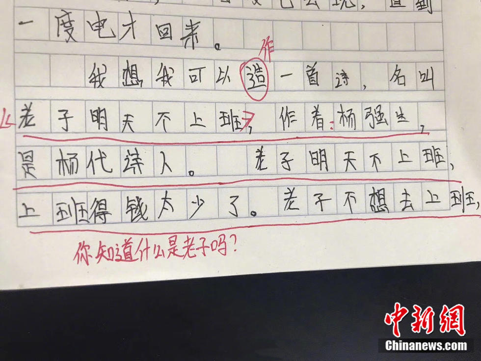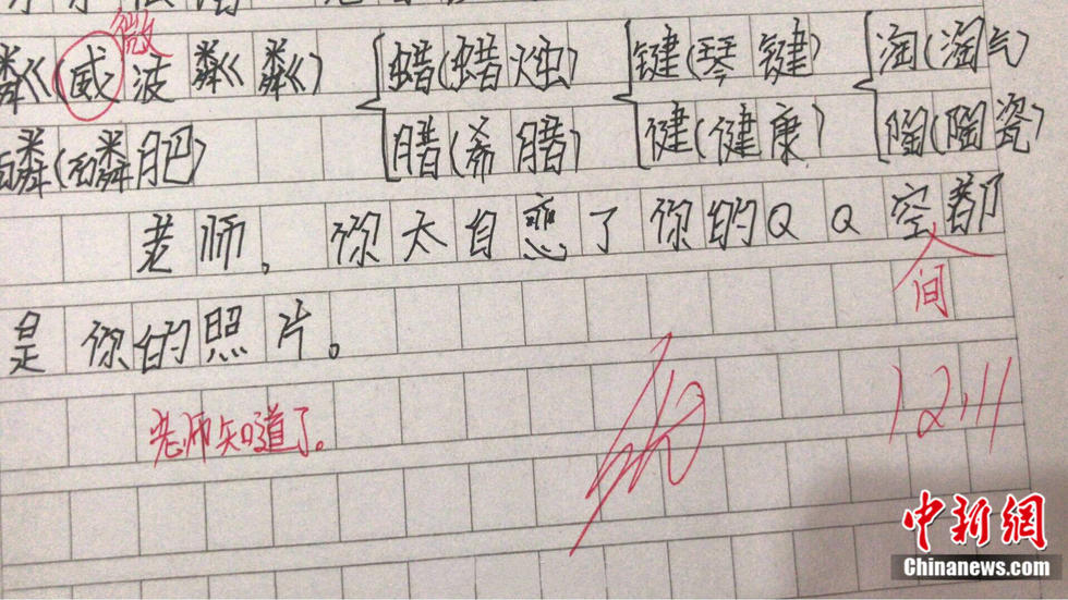近日,貴州省谷隴翁板小學(xué)的語文老師張沁文,曬出了學(xué)生寫在作業(yè)里的“金句”?!袄蠋煟闾詰倭?,QQ空間都是自己照片”;“顏值升高才有人喜歡您”……孩子們的童言無忌令人哭笑不得,老師的評(píng)論也很亮眼。