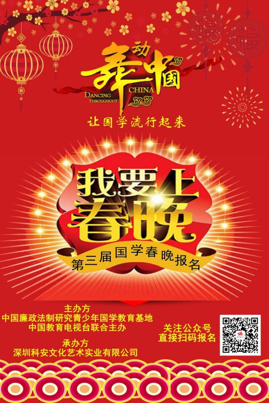 2019年第三屆國學春晚由青少年國學教育基地與中國教育電視臺聯(lián)合主辦,本次春晚打破以往以晚會為主導的籌辦模式,更注重國學文化的推廣及全民國學才藝的選拔。首次以主辦方的報道與宣傳規(guī)模在全國范圍內進行海選。以“舞動中國”為主題在全國范圍內進行強勢推廣,發(fā)出中國國學文化領域的最強音!在長達4個多月的宣傳活動期間,將不間斷運用活動背景、輻射人群、媒體資源、賽事平臺及網絡優(yōu)勢等方式弘揚國學。
