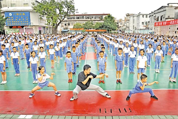 當(dāng)天,利用課間陽(yáng)光體育的時(shí)間,蠔業(yè)小學(xué)1000余名學(xué)生在校內(nèi)饒有興趣地接受了華林派武術(shù)操的教學(xué),華林螳螂拳代表性傳承人冼潤(rùn)長(zhǎng)師傅詳細(xì)地講解了武術(shù)操,并實(shí)地示范。華林派武術(shù)操是“華林螳螂拳”代表性傳承人冼潤(rùn)長(zhǎng)針對(duì)青少年所創(chuàng)編,融入了螳螂拳的武術(shù)元素,深受學(xué)生的歡迎。活動(dòng)不僅讓孩子深入了解優(yōu)秀傳統(tǒng)文化,還讓孩子“武”起來,益于舒緩學(xué)習(xí)壓力。