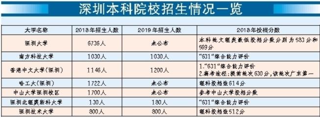在目前已經(jīng)公布今年招生計(jì)劃的深圳高校中,深圳技術(shù)大學(xué)于2017年、2018年分別依托深圳大學(xué)招收226名及807名全日制本科生;2018年11月30日,深圳技術(shù)大學(xué)獲教育部發(fā)函正式成立,于2019年進(jìn)行首年獨(dú)立招生。記者從該校獲悉,深圳技術(shù)大學(xué)今年的招生數(shù)量與去年基本持平,計(jì)劃招收6個(gè)專(zhuān)業(yè)11個(gè)方向的800名新生。2019年,香港中文大學(xué)(深圳)預(yù)計(jì)在全國(guó)26個(gè)省市(自治區(qū))共招收本科生1200人,相比去年稍有增加。南科大也表示,今年計(jì)劃招收本科生1030人,與2018年的招生人數(shù)相差無(wú)幾。深圳北理莫斯科大學(xué)今年將啟用永久校區(qū),招生人數(shù)從去年的130人擴(kuò)大到了180人。