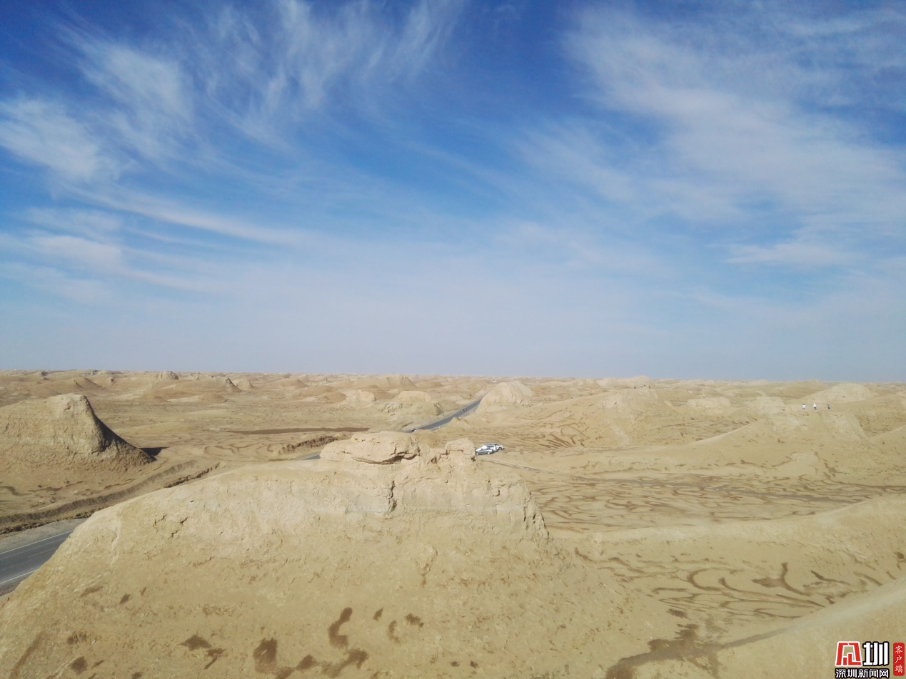 沒去到魔鬼城,但公路兩邊的雅丹足矣震驚。關(guān)于風(fēng)蝕性地貌地理書上有段非常貼切的說明:“地表沙塵和碎屑被風(fēng)力侵蝕搬走,常形成戈壁和裸巖荒漠”。無法想象,四面八方、看不見盡頭的全是一個(gè)一個(gè)有著陡壁的小山包,安安靜靜,不急不躁,好像身處一副巨大的畫卷中,我們真的非常渺小。云彩已是畫好的,小山包也是畫好的,而時(shí)間不再流逝。