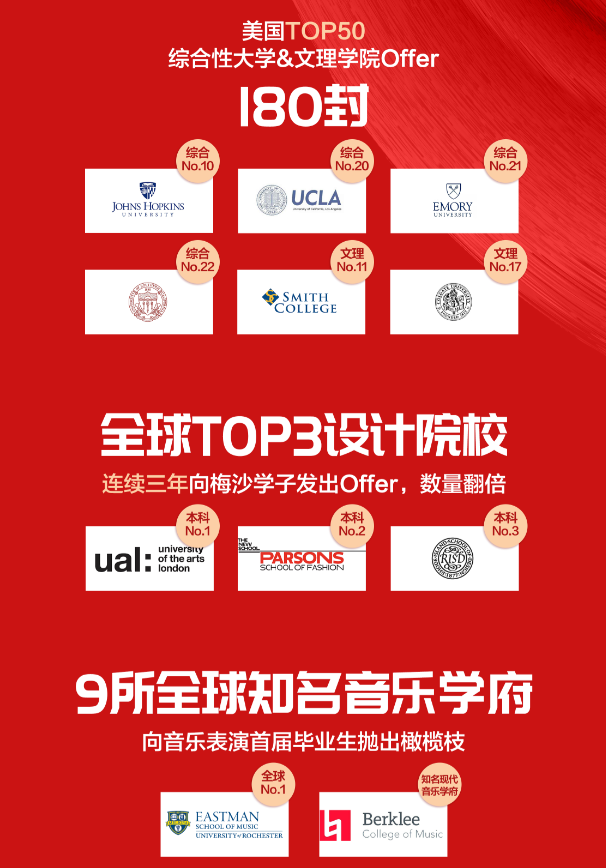 2020申請季還未結(jié)束,梅沙學(xué)子已收獲494封海外名校錄取Offer,獎學(xué)金累計約合人民幣1,960萬元,創(chuàng)三年新高。其中,來自美國Top100綜合性大學(xué)及文理學(xué)院的錄取通知書有356份,來自美國Top50綜合性大學(xué)及文理學(xué)院的錄取通知書有180份。