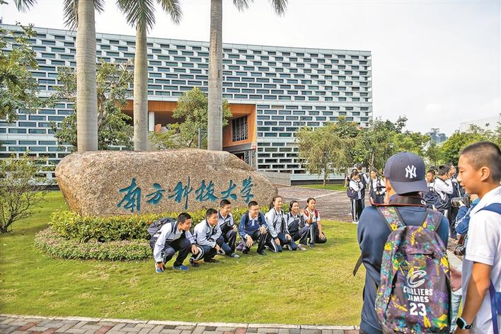對南科大懷有興趣的中學(xué)生在校名石前合影。