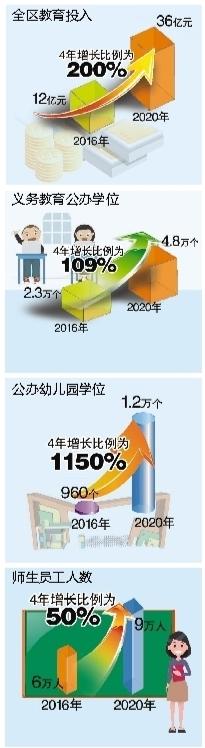 加大教育投入,教育支出增長200%;加快公辦學校和幼兒園建設,公辦幼兒園從2所增加到31所,公辦園學位從960個增加到1.2萬個,增長1150%;新建、擴建公辦中小學12所,義務教育公辦學位從2.3萬個增加到4.8萬個,增長104%。短時期內(nèi)實現(xiàn)公辦學位保障率全市遙遙領先。