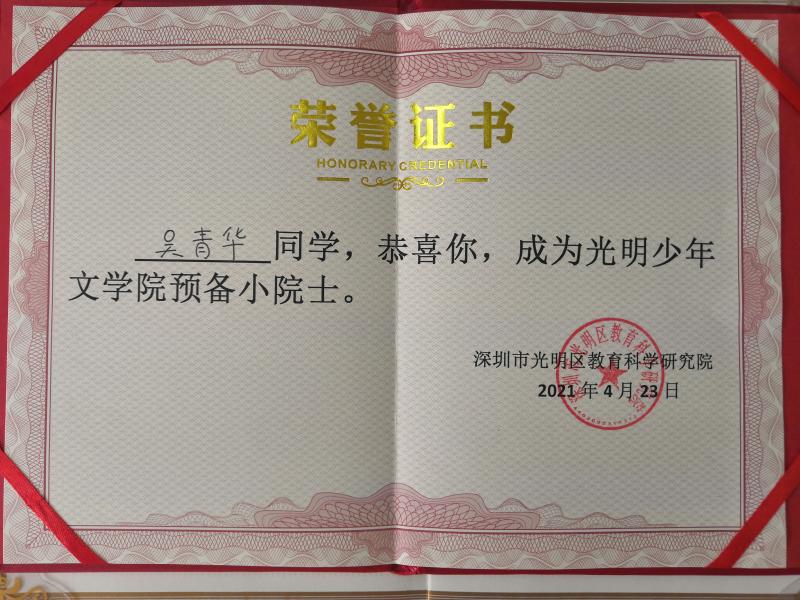 在光明區(qū)少年文學(xué)院評選中,學(xué)校獲批成立“光明區(qū)少年文學(xué)院分院”,陳沐文老師擔(dān)任文學(xué)院期刊編輯,方汶琪、劉梓萌、吳青華三位同學(xué)被授予“預(yù)備小院士”稱號。