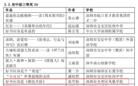 在深圳市4·23世界讀書日“探索閱讀新領(lǐng)域”創(chuàng)作比賽中學(xué)校榮獲優(yōu)秀組織獎,何雨晴、劉宥伯同學(xué)分別獲初小組二等獎、三等獎;阮澤宇、張雪怡同學(xué)分別榮獲初中組二等獎、三等獎。郭瑞芳老師榮獲優(yōu)秀指導(dǎo)老師獎,曾嵽稜、賴美君、李海亮榮獲優(yōu)秀組織老師獎。