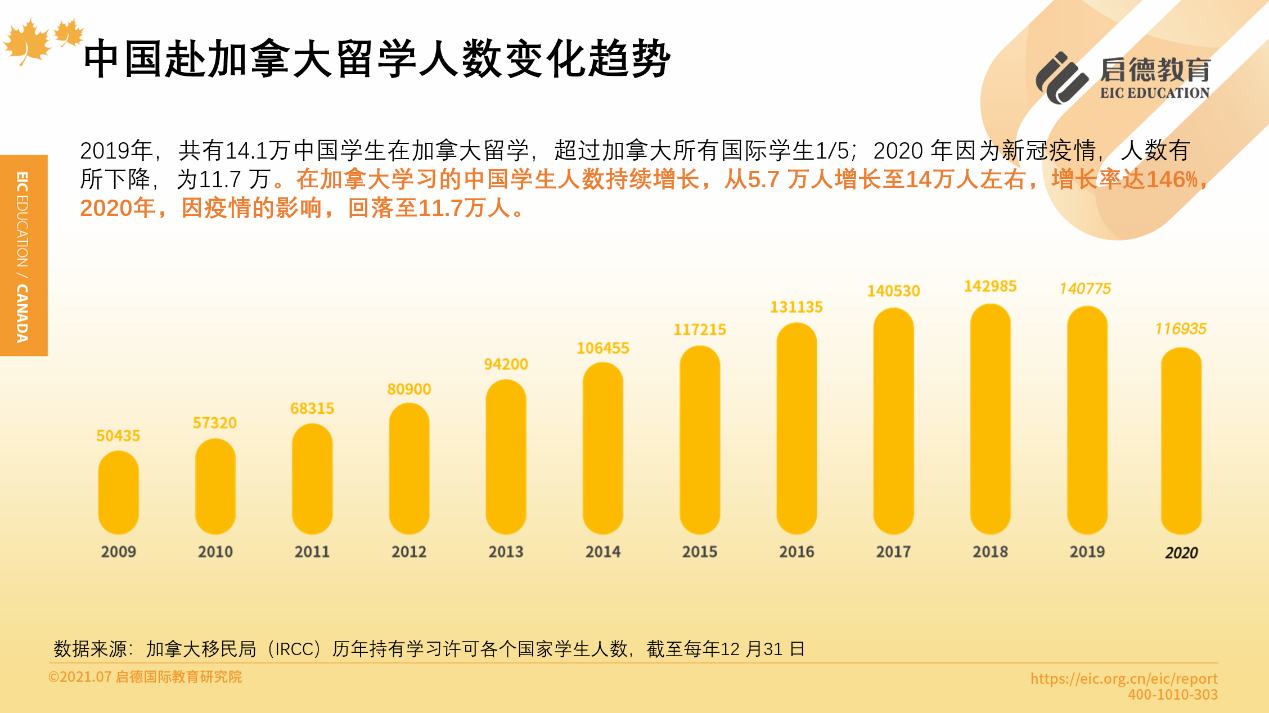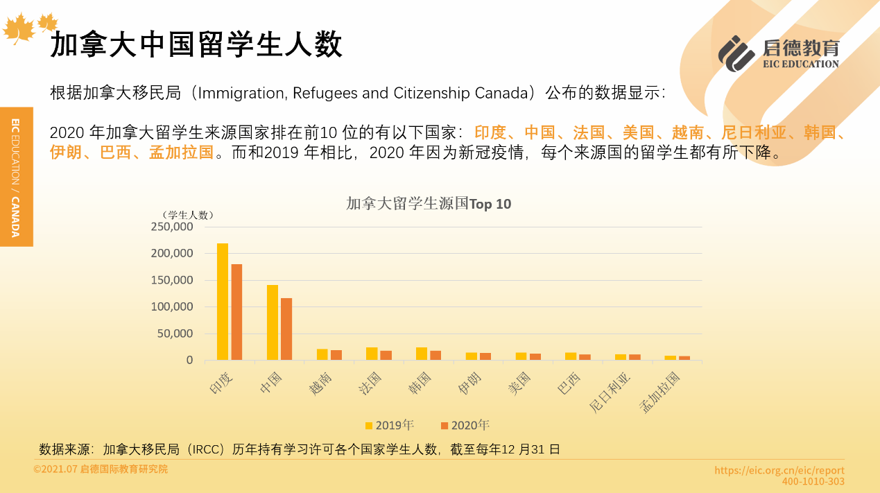 據(jù)加拿大移民局(IRCC)公布的數(shù)據(jù)顯示,2020年加拿大留學生來源國家排在前10位分別是:印度、中國、法國、美國、越南、尼日利亞、韓國、伊朗、巴西、孟加拉國。從2010年到2020年的11年間,在加拿大學習的中國學生人數(shù)持續(xù)增長,從5.7萬人增長至14萬人左右,增長率達146 %,2020年,因疫情的影響,回落至11.7萬人。