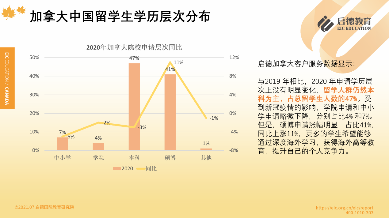 另一組數(shù)據(jù)顯示,2020年中國內地學生新增人數(shù)最多的三個省為安大略?。?9.78% )、英屬哥倫比亞?。?6.17% )、魁北克省(6.49% )。一方面,安大略省與英屬哥倫比亞省這兩個省份的教育資源非常豐富,有多所世界知名大學讓中國學生選擇;另一方面,多倫多、溫哥華、渥太華等大城市均在這兩個省份,工作機會多,移民政策也相對成熟,對希望留在加拿大發(fā)展的留學生很具吸引力。
