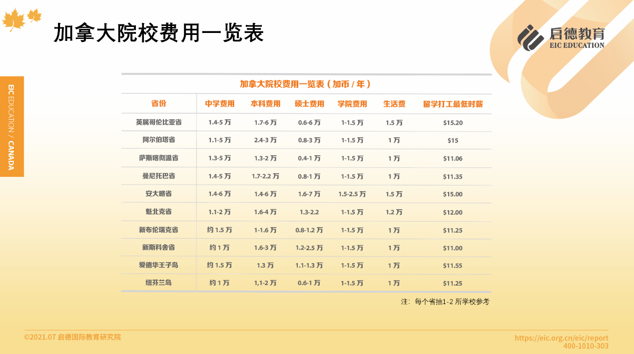 加拿大統(tǒng)計局數(shù)據(jù)顯示,2019-2020學年加拿大國際留學生,本科平均學費為29714加幣 /年 (同比上學年增漲7.6% ),約合16萬人民幣/年;碩士平均學費水平為17744加幣 /年(同比上學年增漲4% ),約合10萬人民幣/年;生活費1萬 -1.5萬加幣 /年,約合5.2萬-7.9萬人民幣/年,總留學費用在美、英、澳、加四大熱門留學目的國中最低。此外,加拿大公立中學學費、生活費用共約14萬人民幣 /年,國際私立中學共約20萬人民幣 /年,私立本地精英中學共約20萬-28萬人民幣/年,私立貴族中學共約26萬 -40萬人民幣 /年。