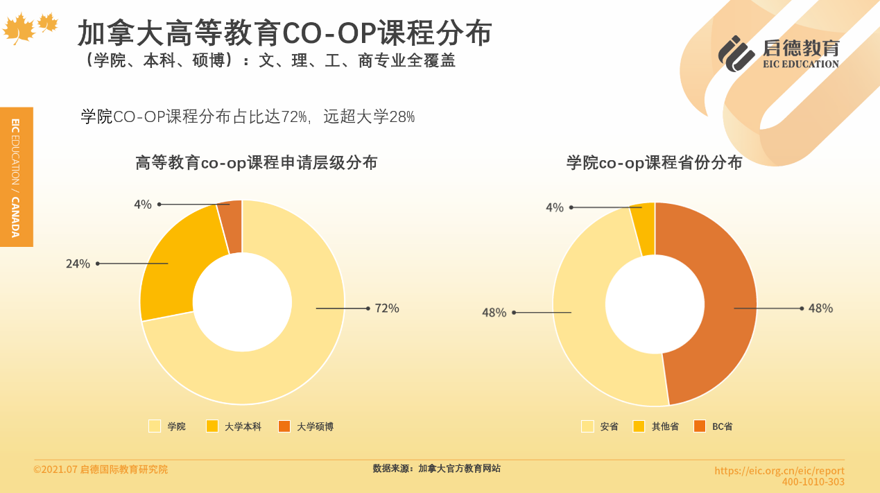 加拿大官方教育網(wǎng)站數(shù)據(jù)顯示,加拿大高等教育普遍開設覆蓋文、工、理、商全專業(yè)的 Co-op帶薪實習課程,其中學院的 Co-op課程占比最多(72% ),其次是大學本科(24% )與大學碩博(4% )。在學院 Co-op課程的省份分布上,安大略省與英屬哥倫比亞省平分秋色,各占48%。
