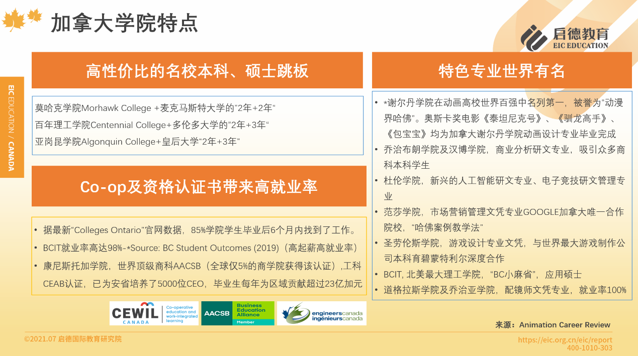 “ Colleges Ontario”官網(wǎng)數(shù)據(jù)顯示,85 %的學院學生畢業(yè)后6個月內找到了工作,91%的雇主對學生表示非常滿意。如康尼斯托加學院,擁有世界頂級商科 AACSB與工科 CEAB認證,為安省培養(yǎng)了5000位 CEO,畢業(yè)生每年為區(qū)域貢獻超過23億加元。而奧斯卡獎電影《泰坦尼克號》、《馴龍高手》、《包寶寶》均為加拿大謝爾丹學院動畫設計專業(yè)畢業(yè)完成。杜倫學院的人工智能專業(yè),道格拉斯學院的配鏡師專業(yè)也是世界有名的特色專業(yè)。