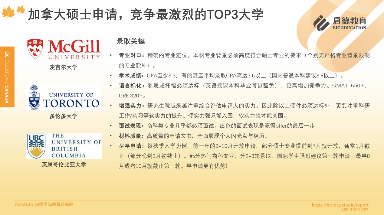 據(jù)啟德留學加拿大項目介紹,加拿大碩士申請競爭最激烈的三所大學為麥吉爾大學、多倫多大學與英屬哥倫比亞大學。申請人 GPA至少達到3.3,有的甚至要求平均錄取 GPA高達3.6以上(國內普通本科建議3.8以上);雅思或托福必須達標(英語授課本科專業(yè)可以豁免), GMAT650+, GRE320+;除硬件必須達標外,加拿大名校注重科研、工作 /實習等軟實力的提升;商科類專業(yè)幾乎都必須面試。