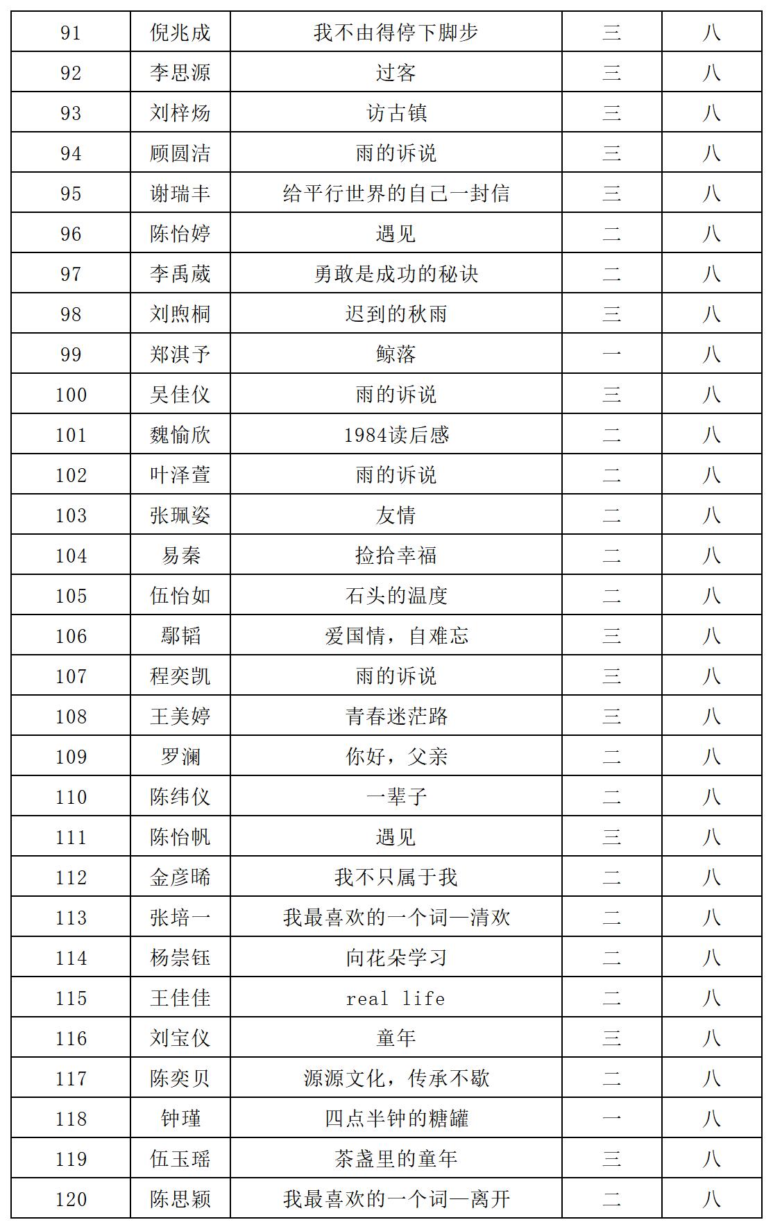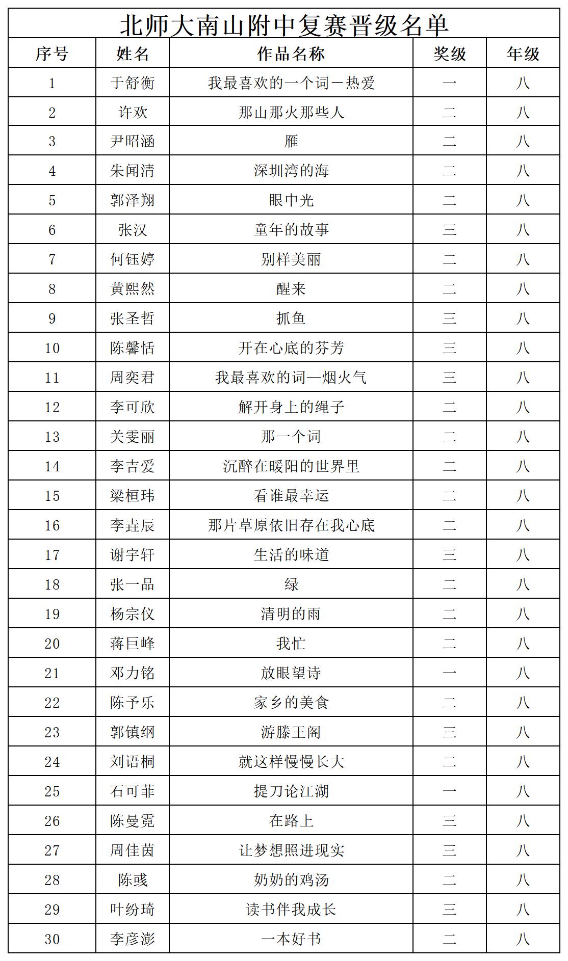 自2021年1月,活動(dòng)征稿啟動(dòng)以來,獲得了深圳市廣大中小學(xué)生、教師、文學(xué)愛好者的熱烈響應(yīng)積極參與,吸引了深圳百余所學(xué)校的上萬人關(guān)注報(bào)名。現(xiàn)公布北師大南山附屬學(xué)校中學(xué)部晉級復(fù)賽名單如下: