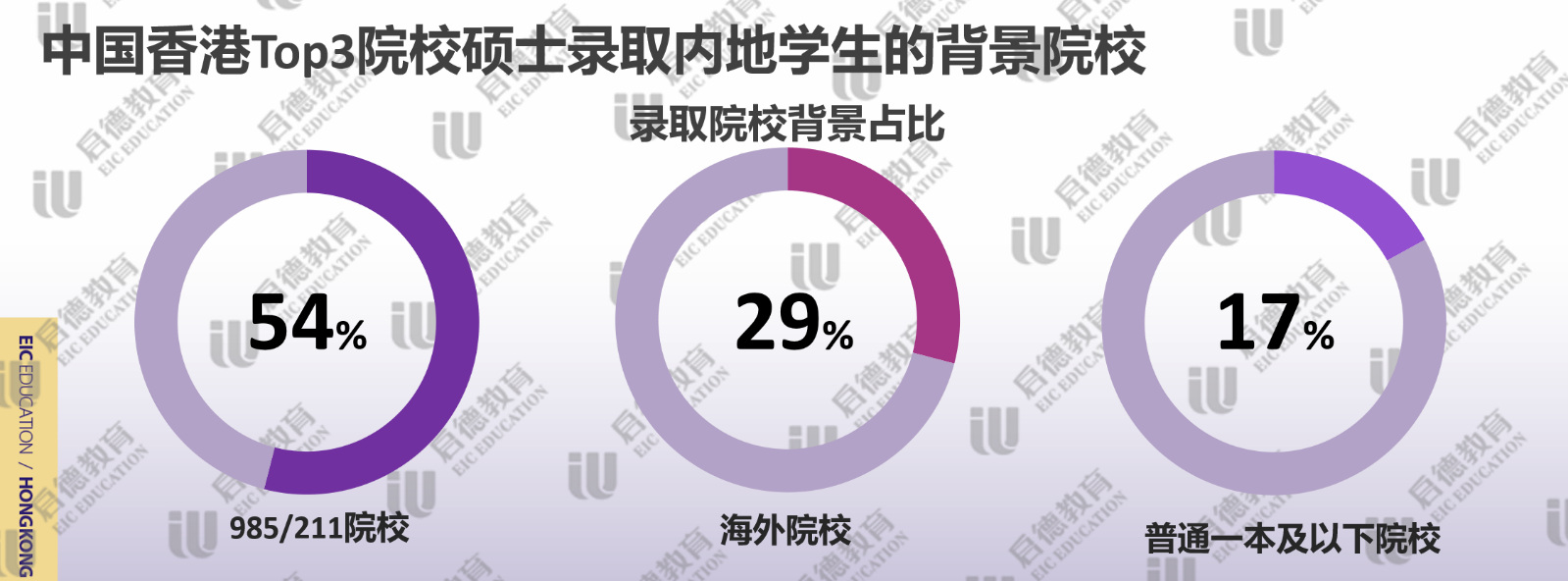 申請香港高校提交雅思成績較多,啟德留學(xué)2021客戶服務(wù)數(shù)據(jù)顯示,近3成錄取學(xué)生雅思成績達到7分或以上,主要集中在金融、會計、傳媒、英語教育等熱門專業(yè);雅思達到6.5分占比幾乎一半,代表了香港高校錄取學(xué)生的平均水平;雅思6分占比不到四分之一,主要分布于理工科或冷門專業(yè)。香港TOP3名校(香港大學(xué)、香港科技大學(xué)、香港中文大學(xué))錄取的碩士學(xué)生中,985/211院校背景的學(xué)生超過了一半;因疫情因素導(dǎo)致海外留學(xué)生的回流,近30%的碩士學(xué)生來自于海外院校本科;雙非院校的占比僅為17%,集中于需要豐富實習(xí)和工作經(jīng)驗的理工科。擁有實習(xí)/科研等經(jīng)歷占比為99%,其中,超八成學(xué)生完成了3次以上的實習(xí)/科研。
