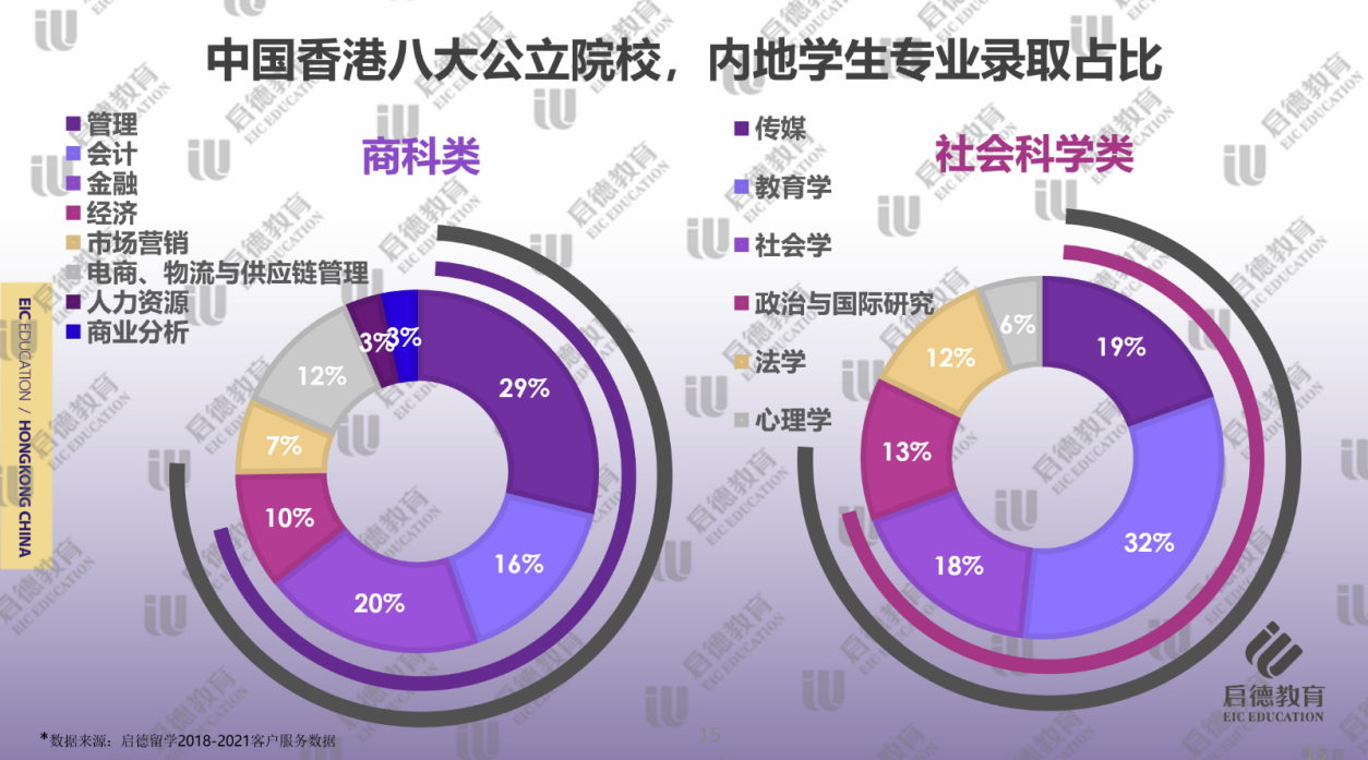 在社會科學(xué)類學(xué)科的細分專業(yè)中,教育學(xué)(32% )、傳媒(19% )和社會學(xué)(18% )的錄取占比較高。由于教育類專業(yè)在內(nèi)地就業(yè)形勢好,香港院校不僅教育學(xué)排名靠前,還擁有適合內(nèi)地學(xué)生的中文教育及對外漢語教育等課程,教育學(xué)專業(yè)在文科生中比重一直居于首位。隨著新媒體行業(yè)的崛起,處于亞洲龍頭地位的香港傳媒專業(yè)也是倍受歡迎。而“公考熱”的持續(xù)使得希望提升學(xué)歷背景的學(xué)生,會考慮繼續(xù)深造社會學(xué)、政治與國際研究此類課程。