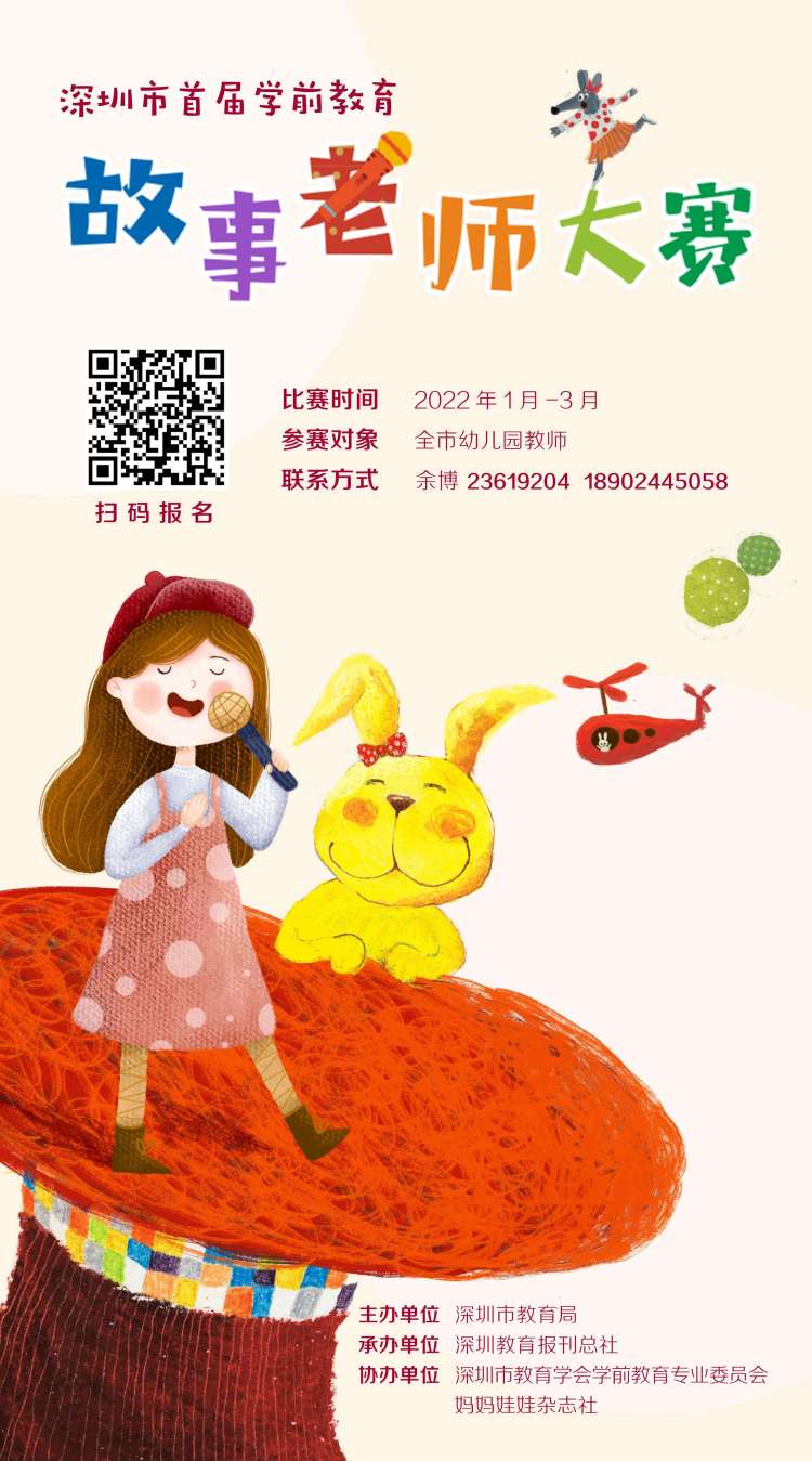 深圳市首屆學前教育“故事老師”大賽本著“以賽促培,以賽促練”的原則,通過研討、培訓,提高幼兒園教師對優(yōu)秀兒童故事的甄選、創(chuàng)編和講述能力,大賽初賽音頻即日起即可提交,截止時間為2月16日晚上22:00。
