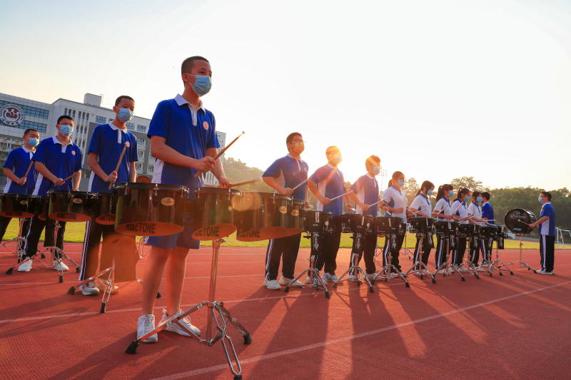 公明中學打擊樂團用歡快的鼓聲為學子們加油助威。(公明中學供圖)