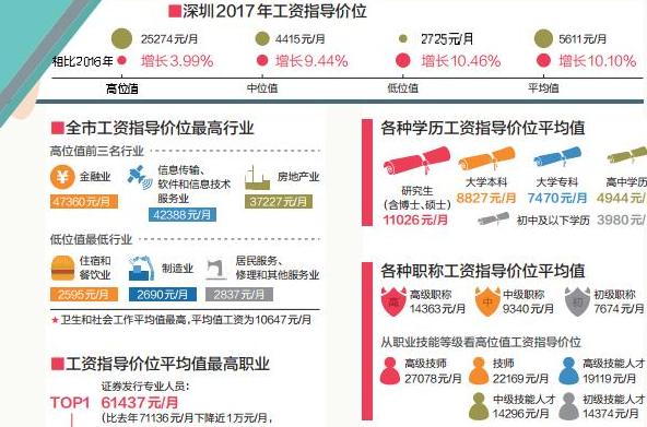 由深圳市人社局發(fā)布的《2017年深圳市人力資源市場工資指導價位》顯示,2017年,深圳工資指導價位平均值為5611元/月,比去年上漲10.10%。