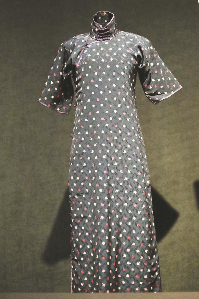 ◆現(xiàn)場(chǎng)展出藏青色襯駱駝絨提花真絲短袖夾旗袍。 均本報(bào)記者葉辰亮攝