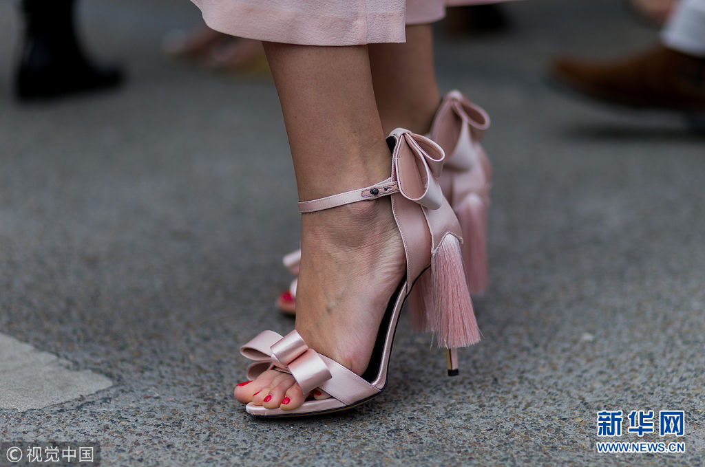 ??? 2016秋冬巴黎高定時(shí)裝周:街頭潮人(7月5日)。 粉色,流蘇,蝴蝶結(jié),魚嘴,一字帶,綁帶,高跟鞋,涼鞋。(圖片來(lái)源:視覺中國(guó))