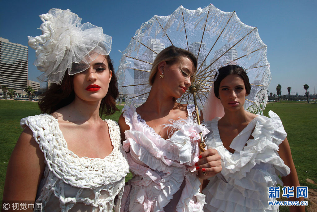 ????特拉維夫,模特身上穿著手紙制作的婚紗。9月9日是個大吉之日,大批新人將會在當日扎堆結(jié)婚。(圖片來源:視覺中國)